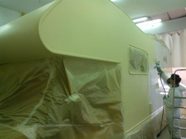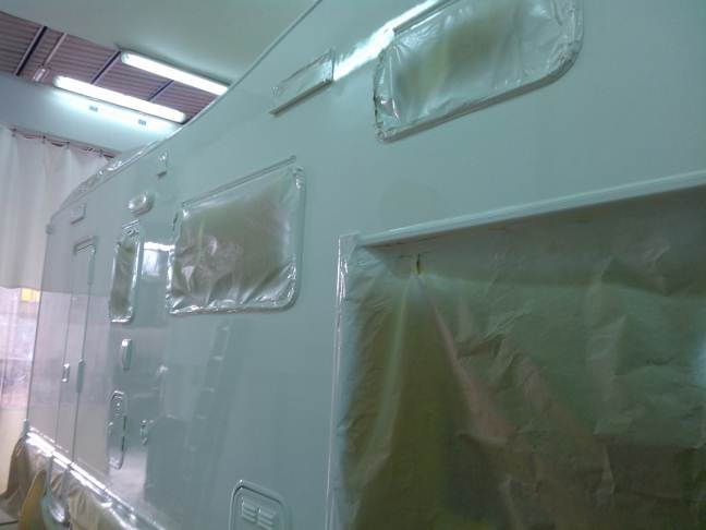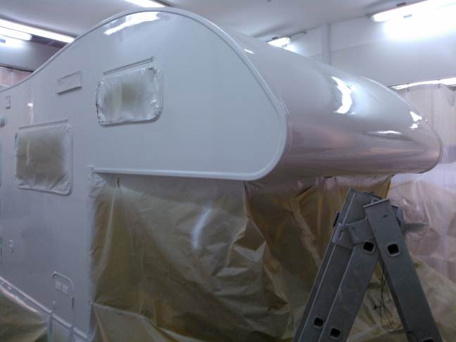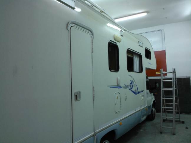 Portato dentro il mezzo. Per Sabato dovrebbe essere finito... Guarda la differenza di lucentezza che c'e' tra la parete e la zona dove dovrebbe esserci il tendalino.. Brutta cosa il gelcoat ;-)