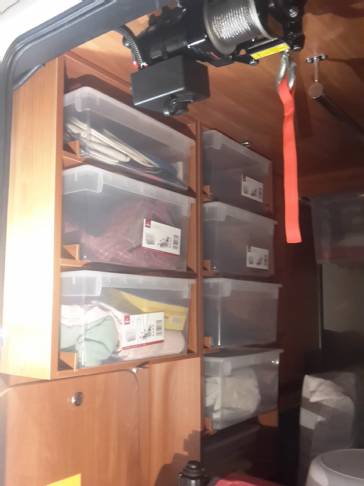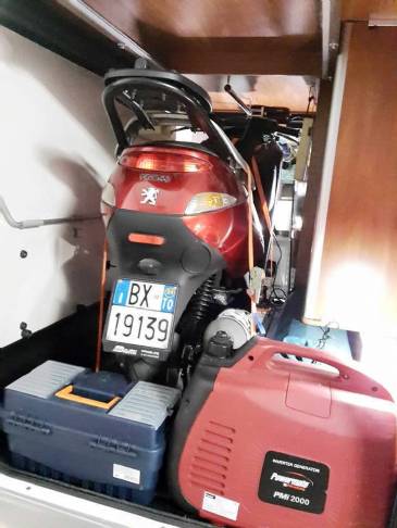 Ciao, io ho strutturato il garage del 3001 in configurazione invernale e estiva (con scooter) per questo motivo, come puoi vedere dalle foto la più critica è quella estiva poiché ho dovuto sostituire i due contenitoriplastici che sono nella parte alta con due più bassi che passino sopra lo scooter. Inoltre ho spostato i 4 golfari , che LAIKA monta per il fissaggio moto, un po' all'interno per poter posizionale sul davanti e sul retro dello scooter, il gruppo elettrogeno, taniche , scatole attrezzi ed altro. Le sedie sono nel gavone anteriore passante e sui lati dello scooter posiziono, teli, tavolino, sdrai, rampa per scooter,ecc.... I contenitori realizzati sopra lo sportello della Combi rimangono sia in configurazione invernale che estiva. Ho poi montato altri golfari piatti (tipo quelli utilizzati nei furgoni cassonati) per eventuali esigenze di fissaggio Roby