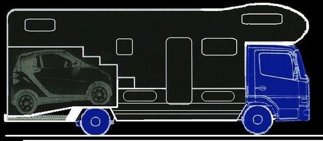 La Smart è lunga 2,70 mt. larga 1,56 mt. e alta 1,57 mt per una massa di circa 850/950 Kg. Quanto sarebbe lungo lo sbalzo posteriore in un camper di 7,5 mt ? Altrimenti la Smart dovrebbe avere parte del muso all'interno dei passaruota e ......... a questo punto la larghezza del camper sarebbe di metri ?? Al posteriore ruote gemellate o doppio assale ??