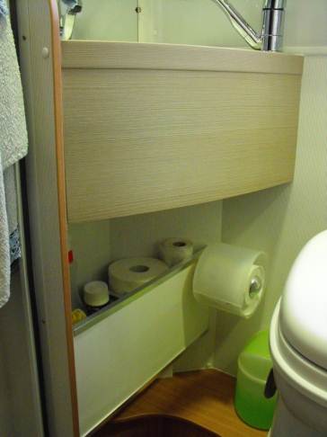 ) . La vera scomodità è la tendina che, quando ti siedi sulla tazza, ti picchia contro la gamba sinistra. Ho ovviato con due gancetti sulla parete sinistra per tenerla semiaperta e rivolta in avanti ( cioè verso la parte destra del veicolo ) . Ho anche costruito un mobiletto sotto al lavandino per detersivi e scorte varie, spostando il portarotolo, come da foto : In risposta al messaggio di Nuova Nordaffari del 07/11/2015 alle 12:32:30