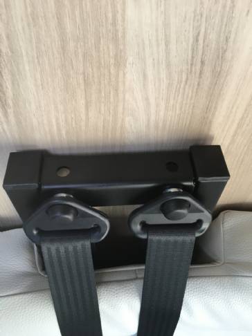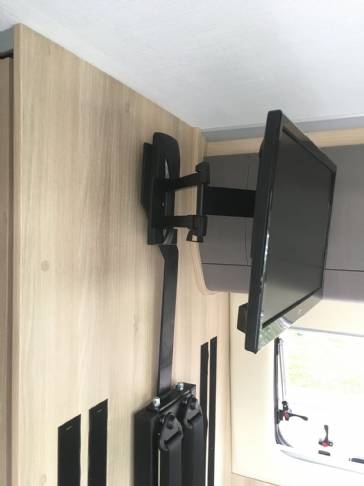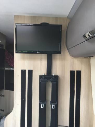 Ciao, la parete dietro la dinette è molto sottile, quindi ho studiato questa staffa da fissare alla struttura delle cinture. Fatto lo stampo su carta l'ho portata da un carpenterie per la realizzazione. Nella parte superiore ho fatto dei fori per montare la staffa porta TV della Meliconi (Ho scelto il modello con il minor ingombro da chiuso, solo 8 cm. altrimenti lo sportello laterale può urtare la TV ). Lo spazio tra la staffa e la parete l'ho risolto con un tampone in gomma in modo che durante il viaggio non oscilli. ti allego delle foto, e se a te o altri può interessare posso dare le misure o maggiori dettagli.