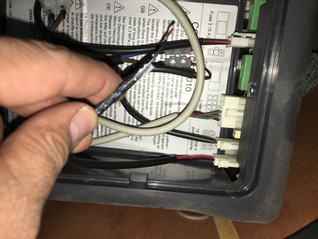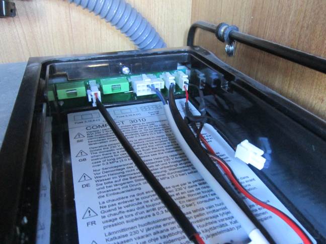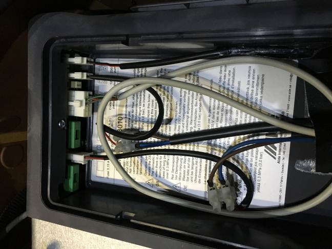 HQuesta è la morsettiera sulla stufa dall'alto in basso abbiamo: cavo 220V pump staccato e isolato cavi 12V pump collegato cavi per pannello comando cavo per fusibile Lato esterno è uguale a tutti gli altri,bocchettone dove esce aria ALDE e cavo per collegare la 220V @ topolone, grazie, non avevo capito che i liquidi rimanevano separati, pensavo che ad un certo punto si unissero. Comunque appena ho acceso ALDE a gas e la pompa è partita l'acqua calda scambiata con Webasto ha riempito il circuito. @maxbon il cavo si ferma lì, non va da nessuna parte. Lo hanno fissato con nastro al telaio ALDE. Credo, ma verificherò, che abbia solo una pompa a 12. grazie ciao.
