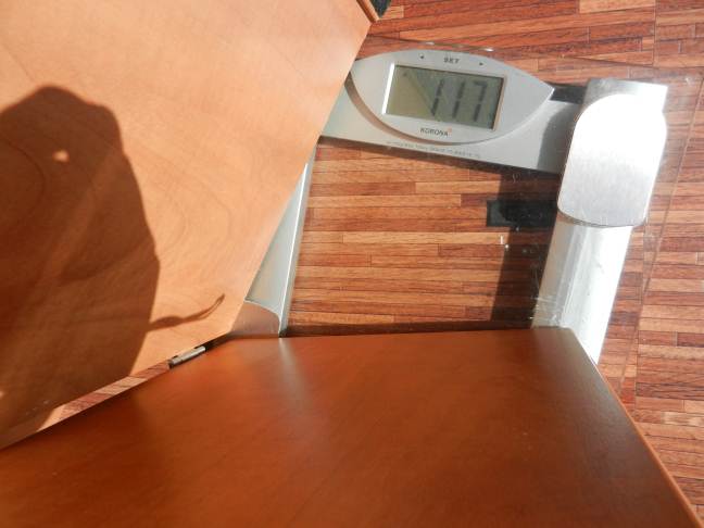 A 8 € l'uno ne prendo anch'io un paio di centinaia..... Oggi mi sono tolto lo sfizio di pesare la porta scorrevole del bagno. La porta è composta da due ante da 1900x270 spessore 25 più un bordo trapezoidale da 3 cm.Sono circa 1,083 m2 . Cercando su internet ho scoperto l'esistenza della Nord compensati azienda specializzata in legnami per barche. Marinaio dove sei !!!! perché devo scoprire queste cose da solo La porta del bagno fatta con i pannelli Isomar HC verrebbe a pesare meno della metà ossia intorno ai 5 kg risparmiandone ben 6,7 kg. Qualcuno sa dove si possono comprare quei pannelli e quanto costano ? Un altro particolare quasi inutile è il seguente Il portellino del vano batteria .............peso 930 grammi Anche quello a fianco serve solo a riparare i termosifoni. Mettendo un grigliato fine di alluminio si dovrebbero risparmiare altri 2 kg.