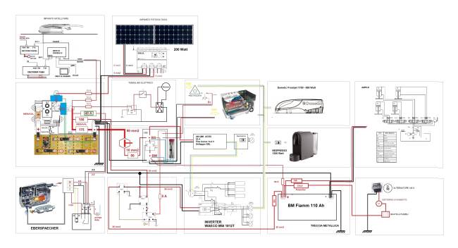 Non è possibile anche se l'idea è buona. Abbiamo impianti molto diversi uno con l'altro. Cambiano oltretutto con il passare degli anni. Nel primo Cartha la centralina era nel centro del camper. Nel secondo dietro con unaparte di impianto ( vedi scatoletta parallelatore SB 150 ) in centro vicino all'Alde. In quello attuale l'SB 150 è sparito e il relè è tornato nella centralina come nel primo del 2009. Anch'io ho messo giù una bozza, per adesso molto incompleta, del mio impianto.