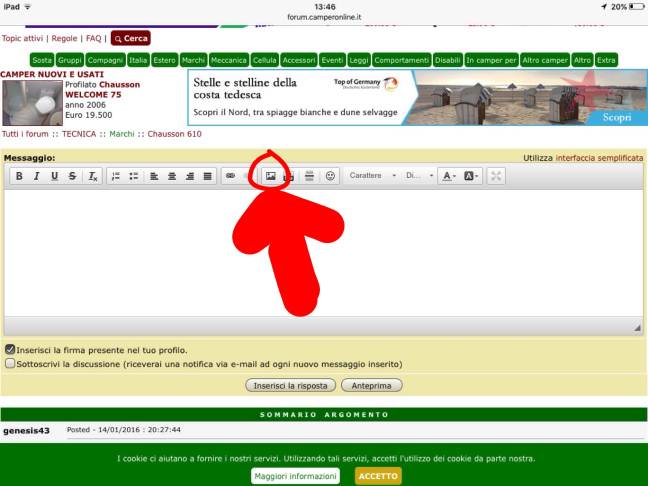 Ciao a tutti, da un po' di tempo seguo con piacere i vostri scambi di informazioni e commenti sui nuovi modelli Chausson. Circa due settimane fa ho ritirato un Welcome 628 eb su Transit 155 cv che si è rivelato per me subitouna piacevole novità per il confort di guida e la brillantezza del motore, tanto da non farmi, per il momento, rimpiangere il Ducato. Solo alcuni acciacchi di gioventu : il lavandino della cucina che non scarica perché il tubo non ha la pendenza sufficiente, risolto da me semplicemente aumentando la pendenza. La luce sopra il basculante che non si accende, o meglio fa' un lampo ma poi non si accende ( polarità invertita?!!) ed in viaggio un fastidioso rumore, proveniente probabilmente dal pantografo sinistro del basculante che tende a scomparire se viene messo in tensione tirando il basculante verso il basso. Vista la lontananza del concessionario che mi ha venduto il camper, aspetto di vedere se insorgono altri problemi prima di portarlo a controllare. Un cordiale saluto a tutti voi. Andrea