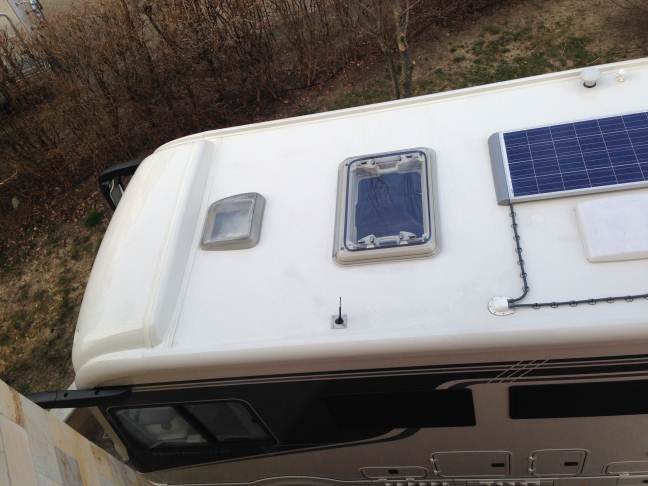 E che poi sono sparite anche le righe nere dei cavi inscatolate in canalina il alu sospesa (che non tocca il tetto)! Bianchi sono anche tutte le scatole di connessione FV e la piccola antenna Tv è sollevabile a forbice (per le pochissime volte che serve) E' perchè il garage è a soli 5 cm dal colmo del camper. Franco