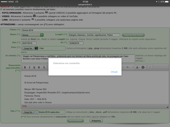 Sto tentando di pubblicare il diario di bordo della Grecia, ma arrivato alla fine mi appare invariabilmente la scritta Estensione non consentita ed nostre elimina le immagini. Se si riferisce al formato del documento, èun docx, così come richiede là macro di invio, se si riferisce al peso del documento, rientra bene nei 15 M consentiti. Anche lo scorso anno con quello della Sicilia ho avuto gli stessi problemi e poi non avendo più tempo, ho lasciato perdere. Qualcuno sa aiutarmi ? anche in considerazione che lo sforzo di farlo, meriterebbe una sua conclusione...... Angelo