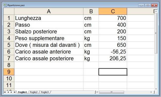 Un piccolo file su Excel può dare quale è l'incidenza approssimativa di un peso in base a dove grava. Qui sotto un esempio di uno scooter nel garage di un camper da 7 metri con passo 4. La formula da inserire nellacasella C6 è =C4*((C1-C3)-C5)/((C1-C3)-(C1-C3-C2)) Mentre nella casella C7 è =C4-C6 Nel caso dello scooter si ha un alleggerimento di circa 56 kg dell'anteriore mentre sull'assale posteriore un sovrappeso di 206 kg.