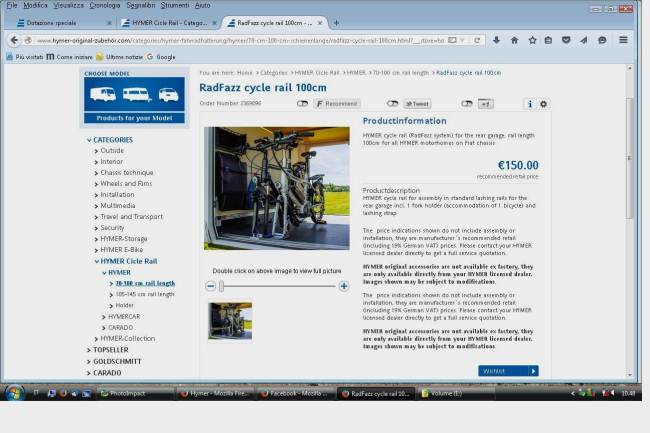Però, così occupa tutto il garage, non è piu semplice appoggiare le bici una sull'altra alla parete di fondo e tirare una cinghia o elasticone? Così facevo nel B-514 e mi rimaneva piu di metà del garage libero peraltro (suddiviso su due piani con una mensola). Ora invece nel nuovo camper ho fatto diverso e sfrutto la piegabilità delle bici e quindi occupo con le bici neppure 1/4 dello spazio del garage. piano in 5 sezioni leggerissime ma resistenti in tamburato, semplicemente appoggiate e tutto rimovibile in un attimo. Una buona organizzazione del garage, secondo me, deve prevedere un posto per ogni cosa e che si possa prendere ogni cosa senza dovere spostare prima altro. Nel mio caso solo sfilare la ruota di scorta prevede di togliere cunei, arrotolatore etc, ma si spera che non sia un uso frequente. Oppure posso sfilare la ruota di scorta da sinistra semplicemente togliendo tavolino (arrotolabile) e le due poltroncine (a ombrello) che stanno sotto al piano, a sinistra, assieme alla seconda cassetta WC. Però tavolo e poltroncine stanno per il 99% a casa perchè non le usiamo quasi mai e quindi in pratica la metà sinistra del garage è quasi sempre praticamente vuota. Tommaso IZ4DJI www.iz4dji.it
