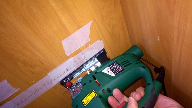 Su su, veniamo a cose serie, sabato vado giù di sega, devo praticare uno sportello in una parete di legno dell'armadio per poter accedere alla parte elettronica della combi che fa le bizze. Come potete vedere con il seghetto ho problemi di spazio a iniziare il taglio dall'angolo. Fare un foro al centro della linea di taglio è esteticamente brutto anche se poi il posto sarebbe abbastanza nascosto da due mensole che ora sono smontate. Un mio amico mi ha dato il rotorazer, mi consiglia di fare tutto il taglio con quello usando una barra di alluminio fissata, con delle cagne, come guida. Il fatto è che il rotorazer ha una lama decisamente più larga del seghetto alternativo. Consigli? La parete che devo tagliare, con tutte le viti svitate, non viene via perchè ci sono delle spine a sinistra e in basso che non la fanno sfilare dalla sua sede. Per toglierla dovrei smontare la parete di legno tra cellula garage