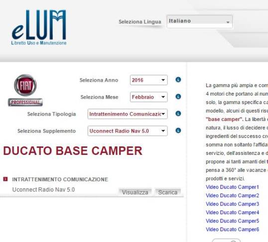Ciao, ti conveniva andare direttamente sul sito Fiat Professional dove c'è quello che chiamano eLum (Libretto elettronico uso e manutenzione) Questa sotto è una schermata. Il libretto dell'Uconnect montato sul Ducato lodovresti poter scaricare da questo indirizzo Io l'ho scaricato perché alla consegna l'ho trovato in tedesco (lingua a me quasi del tutto sconosciuta). Un saluto Alberto