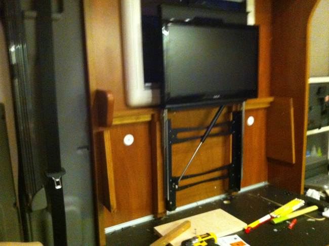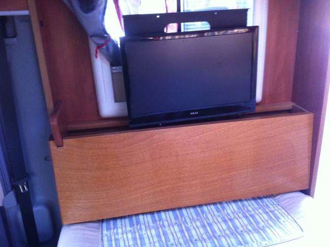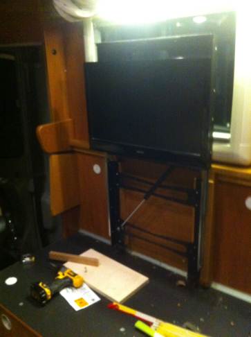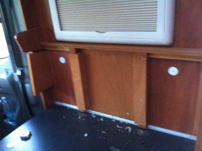 Sempre nella costante ricerca di alleggerire il mezzo ho smontato tutta la struttura porta tv dietro la panca laterale realizzata tutta in truciolare grosso 2 cm sostituirò anch la tv 22pollici lcd che funzionava solo a 220 con una 19 led a 12 volt a breve foto !!