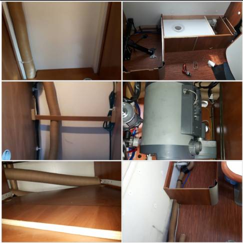 Ho avviato i lavori per la riorganizzazione dell'impianto di riscaldamento, senza curve e ricurve e senza passaggi esterni, e visto che ci sono sposto anche il serbatoio dell'acqua interno, con conseguente ottimizzazione degli spazi di stivaggio, e tiro via anche il pannello che c'è nell'armadio. Smontato anche la stufa e pulita in modo certosino.