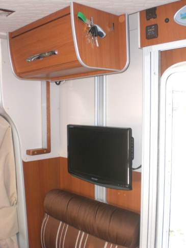 Una buona giornata a tutti i Mc Friends. Oggi sono un attimino fuori fase, dopo che ieri ho dovuto sottopormi ad una sessione dal dentista abbastanza dolorosa. Lo dico per l'amico Maurizio, spero di essere in sesto per sabatosera, visto che nel paesino vicino a Magenta la locale proloco ha organizzato una riunione tecnica conviviale del Gran Bollito Misto oltre ad antipasti e risottino con la luganega. @ Umbe : felice del tuo nuovo acquisto che sono sicuro ti darà molte soddisfazioni. Come ha detto Clau61 qualche aggiustamento in corsa è normale che dovrà essere sopportata, ma nel complesso sono inezie. Per il Tv, penso che l'unica soluzione sul 60G sia questa : Lo produce la Project 2000 anche in più versioni con la possibilità di bloccare il tv all'altezza desiderata. La posizione più comoda, a mio parere, è sulla parete del bagno a sx dell'ingresso, anche perchè se non sbaglio, la presa d'antenna con la 12v e la 220v si trova sopra la porta. Nel mio Mc4, non avendo la finestra sulla parete della poltroncina ho fatto così : In questa posizione la tv si vede dai sedili in cabina e dal divanetto a L ed è anti torcicollo garantita, inoltre la posso abbassare nel caso dovessi utilizzare il basculante. Mario