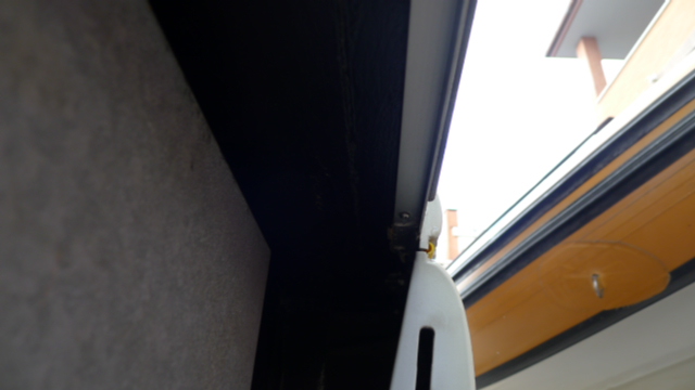 la ganba della T è fissata al pavimento con viti, il tetto della T un angolo è sigillato alla parete l'altro angolo allungando la parete funge da sgocciolatoio l'acqua x 1/2 cm non riesce a girare verso il pavimento, il copriviti giallo è ancora il suo originale, tempo fà abbiamo fatto una cordata di ecovippari per far rifare il copriviti credo che sia ancora sia disponibile, non propio uguale ma simile