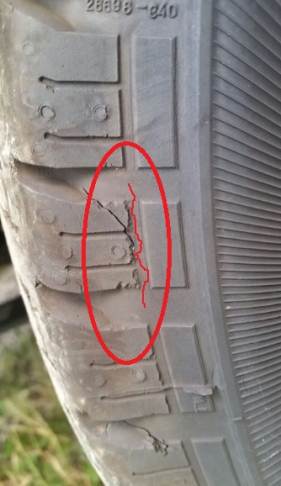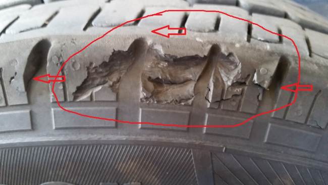 in questa sono evidenti i segno di uno strappo meccanico a cui lo pneumatico ha tentato di opporsi creando tutta quella superficie di gomma frastagliata chiara traccia di sforzo fuori canoni canoni previsti; in caso contrario, cioè un difetto di mescola, ci sarebbero superfici lisce e levigate date dalla mancanza di coesione della gomma
