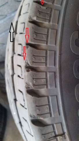in questa è possibile anche definire che la rotazione dello pneumatico (freccia nera) conferma come il punto di innesco e la propagazione delle fratture (frecce rosse) siano contrapposti quindi plausibili; il senso di rotazione si evince dallo stato di usura dei tasselli
