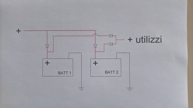 Sul mio primo camper ( un INCAR del 1983) avevo 2 batterie servizi al piombo in un vano stagno sotto al sedile. In origine la batteria era una sola da 75 A ed io ho aggiunto una 60 A recuperata chissà dove. Le avevo collegate così. Il problema erano i diodi che scaldavano da morire ma allora mi divertivo a fare pasticci, nemmeno ricordo che diodi fossero !!😁 In risposta al messaggio di poffalbacco del 14/06/2017 alle 11:02:20
