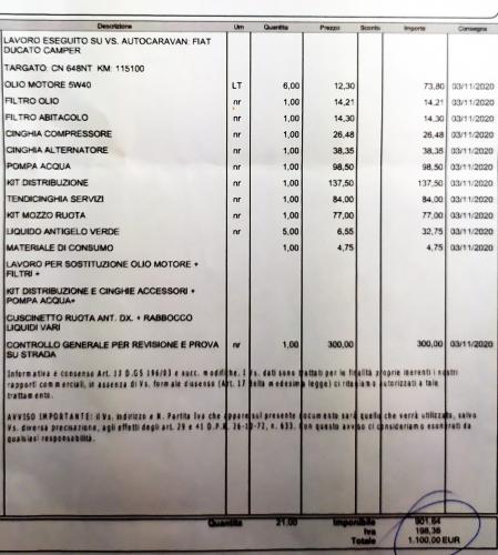 In risposta al messaggio di eccomi del 04/11/2020 alle 22:53:04Salve sul mio Iveco 3000 cc tutto quello che hai fatto in più olio cambio olio differenziale pastiglie e olio freni in tutto a 670 euro ivato