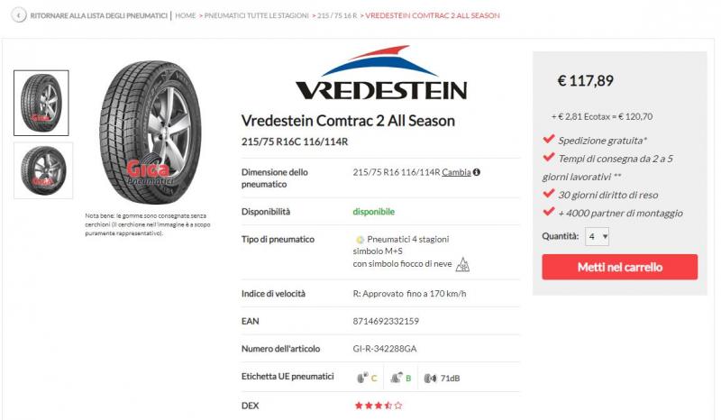 Devo sostituire i pneumatici del mio mezzo ed ho deciso di montare delle 4 stagioni. Anche per ragioni economiche vorrei evitare i grandi e famosi marchi (molto marketing e prezzi alti) e orientarmi su produttori globalima che abbiano una fascia di prezzo medio. Opterei per una di queste due marche: Vredestein (di cui utilizzo delle invernali su un'auto) con etichetta UE prestazione sul bagnato B e Falken con etichetta UE prestazione sul bagnato A inserisco anche info relative al Michelin Premetto che ho un mezzo biasse e che i miei pneumatici sono sollecitati molto meno che per altri mezzi; infatti le pressioni di utilizzo sono 4-4,5 anteriore e 3,5 posteriore. Leggerei volentieri vostri pareri, a parte il solito con la sicurezza non si scherza Ringrazio anticipatamente chi vuole qui dire la sua Saluti Saluti Massimo