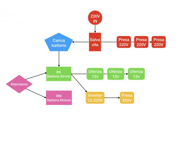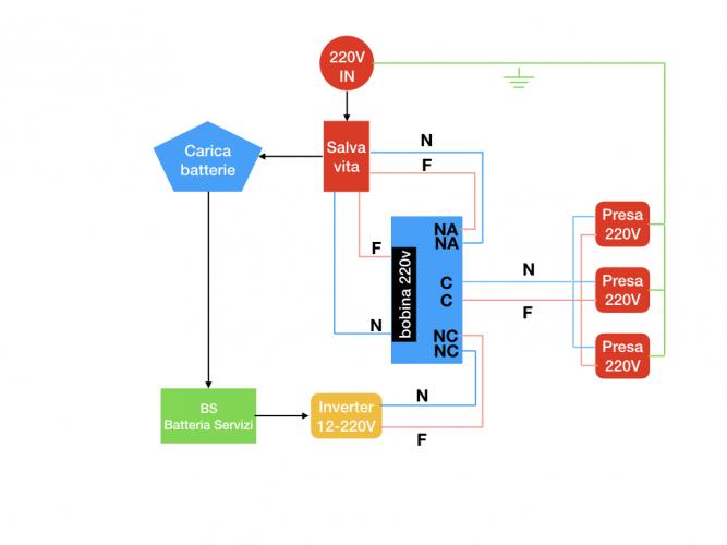 Pertanto, a mio parere, il circuito che propone robvision deve includere anche un dispositivo di ritardo intenzionale: del tipo che quando collego la 230 della colonnina, il teleruttore mi interrompe il circuito che alimenta le prese dall'inverter (e possibilmente, aggiungo io, mi spegne l'inverter agendo sul comando a distanza), cinque secondi di ritardo, e sopo dopo questo tempo commuta un secondo teleruttore che collega le prese di bordo alla alimentazione 230 della colonnina. Idem al contrario: appena stacco l'alimentazione da colonnina, il teleruttore che abilita sulle prese del mezzo la alimentazione da esterno rimane commutato per 5 secondi (per evitare commutazioni inopportune dovute a microinterruzioni della alimentazione, vedi le cd. "richiusure automatiche" Enel, poi sgancia, altri cinque secondi di attesa e solo poi mi commuta il teleruttore che accende l'inverter e abilita la distribuzione alle prese di bordo di quanto erogato da inverter.