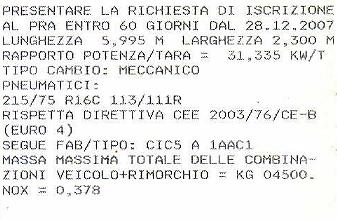 anche se a ottobre le ho pagate 82 euro... bhoooooo non fanno rumore e mai avuto problemi di aderenza! ovvio che se le comprassi di marca ci fare almeno due anni... ma preferisco ad ottobre avere le gomme nuove non di marca... che "vecchie di marca" ma con almeno 30.000km sopra :-)quote:Risposta al messaggio di maomig inserito in data 21/03/2014 22:35:17 (Visualizza messaggio in nuova finestra)>>Ciao Maurizio, era riferito alle gomme che monto tuttora. Questa e' la targhetta che ho sullo sportello lato guida. Non ho mai capito se la targhetta e' Ford oppure Rollerteam. Ho fatto caso ora che la somma degli assi e' di 4000kg. Comunque stasera ho capito che la pressione max non deve per forza essere a 80PSI