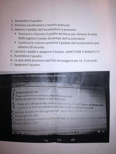 Ciao, ho eseguito la procedura che hai postato, riaccenso il quadro la spia dell'olio ha lampeggiato x 5 secondi ,ho spento e dopo qualche secondo ho riacceso spia service sempre accesa Ducato x 250 del 2010/2011
