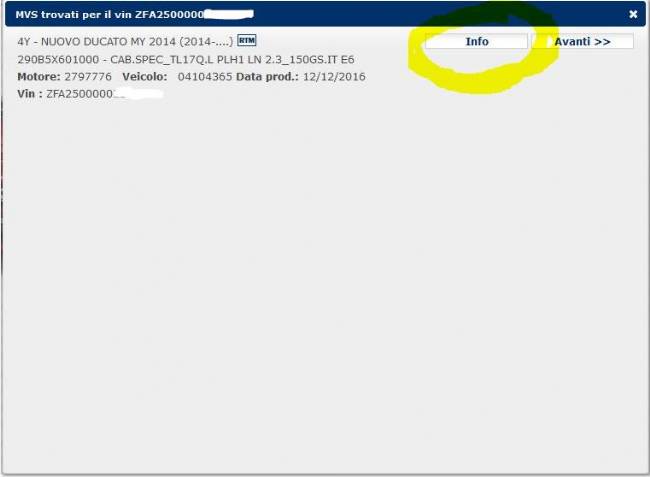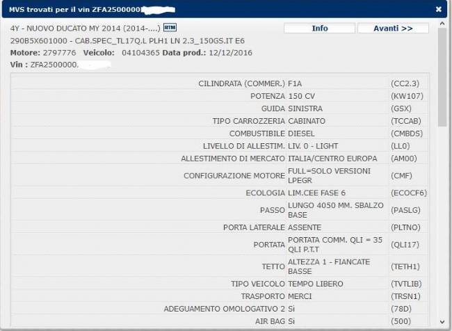 Come da titolo sono riuscito a trovare il sito dove inserendo il n. del vostro telaio ( numero VIN lettera E della carta di circolazione ) potrete sapere tutto del vostro Ducato. Dopo aver inserito il VIN premete lafreccetta a destra e vi appare la videata sotto: Premete Info ed il gioco è fatto, se poi voleste anche sapere ulteriori informazioni sul vostro ducato con esplosi e pezzi di ricambio premete invece il tasto Avanti Sperando di farvi cosa gradita... Ciao