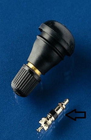 nella foto qui a sx lo spillo è il particolare metallico (indicato dalla freccia) che solitamente il gommista smonta con un piccolo giravite mentre monta e smonta le gomme, anche lui ha dei particolari in gomma che potrebbero deteriorarsi, questo è più facile da sostituire in quanto non è necessario smontare la gomma e tutta la valvola.