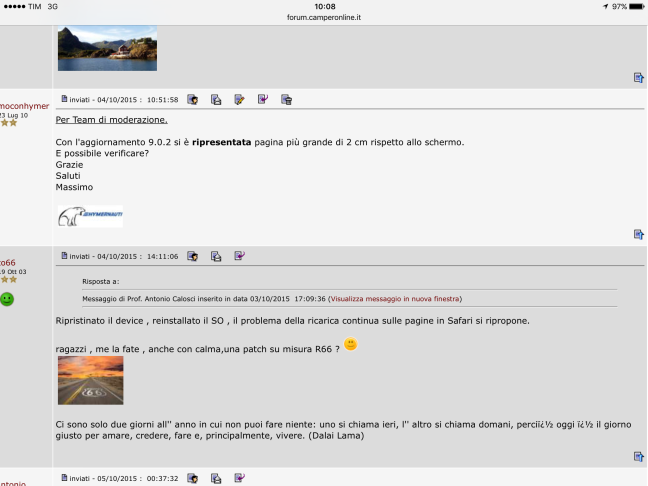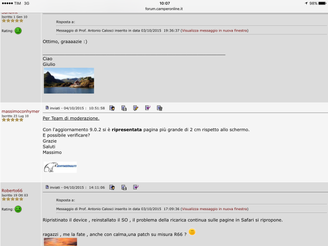 Piuttosto...PER IL TEAM AMMINISTRAZIONE DEL SITO: Non so cosa abbiate sistemato per farlo vedere sulla melma Apple, ma ora il risultato è che sui device android la pagina non si zoomma più!!!!! Rimane fissa nonostante loswipe e gli occhialuti non ci vedono una cippa! Sistematelo com'era prima per favore, tanto era un problema di Safari che non riesce a visualizzare i siti desktop, non certo di Camperonline... Provato su S4, Note 8, Note 10.1, Tab S 10.5 con android da 4.4.2 a 5.xx.xx... Gianluca & C.