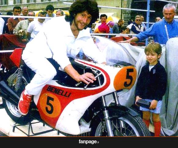 Una foto datata con Graziano Rossi in sella alla mitica Benelli guidata anche da Saarinen , e il piccolo Valentino che osserva