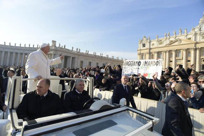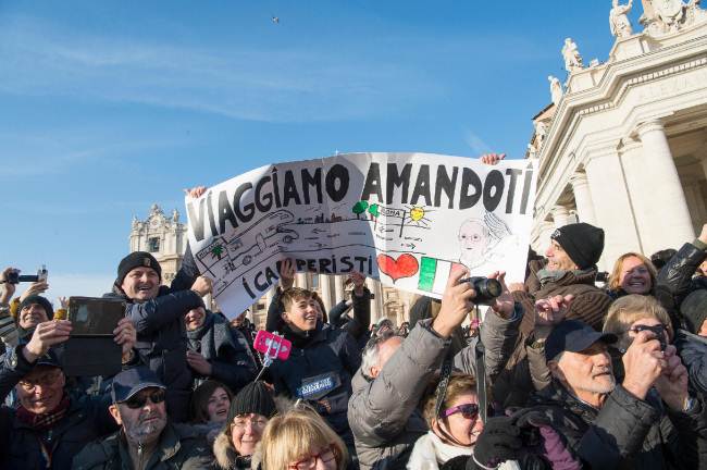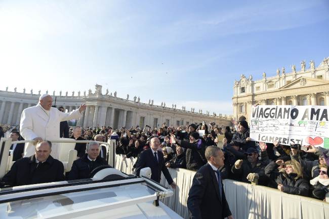 in data 30 dicembre finalmente papa francesco ci riconosceva come movimento di liberta, amore, sono il primo camperista che ha portato all udienza un disegno creato con la mia famiglia, srotolato davanti a lui,,,,,,,,,,,,fermo'la papamobile si mise a ridere e con il pollice alzato verso il cielo ci ha benedetto finalmente per tutti i nostri viaggi, le nostre vite, le nostre famiglie ecc........un emozione unica , eravamo 55 camper un po da tutta italia circa 200 persone abbiamo assistito all irripetibile, ora ho foto dappertutto ma il suo sguardo che mi trapassa,,,,,io sono quello con il cappello blu e il pollice alzato,,,,,mi e' entrato dentro, per qualunque informazione scrivetemi. ciao alan alboresi