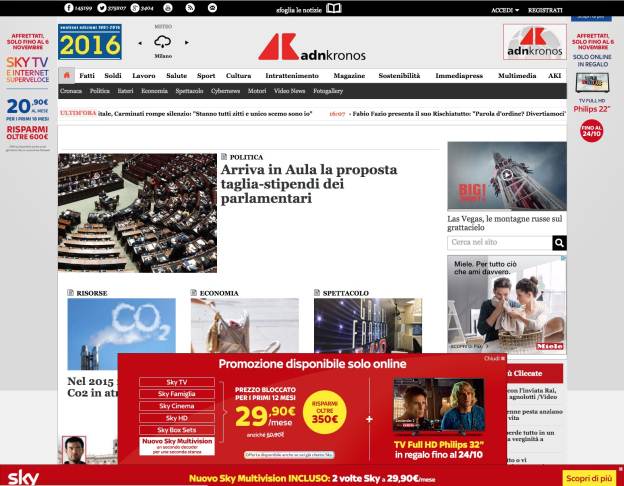 Sono iscritto a diversi Forum e l'unico letteralmente imbottito di pubblicita' e' COL. Il prezzo da pagare per avere COL gratuito ? No grazie, questo e' business is business. In un notissimo (e grosso) Forum di chitarristiabbiamo appena rinnovato tutto, spesa annuale € 548 che vendono coperti da donazioni volontarie degli iscritti (che hanno piacere di contribuire, non e' un obbligo) ed io ho fatto la mia piccola parte. E' un Forum totalmente senza pubblicita'. Sai COL una cosa ? Io ho cominciato a disamorarmi di te proprio quando la pubblicita' inizio la sua invadenza riducendoTi ad una finestrella tra i banner e messaggi vari, mi spiace, mi piacevi di piu' prima quando eri libero come... girare in camper. Ah, non ho risposto alla domanda iniziale, SI anche io sono invaso dalla mezza schermata di SKY Ciao Giulio