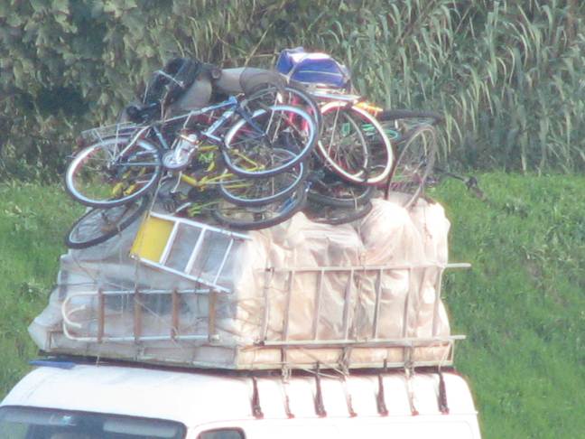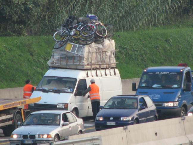 Sempre in zona Bologna, ma più recentemente (diciamo l'anno scorso) mi è capitato di vedere a più riprese furgoni a tetto alto tipo quello del servizio dell'ASAPS, ma con targa rumena, pieni fino al soffitto di vecchi ciclomotori e scooter ammucchiati alla rinfusa: ferraglia recuperata allo sfascio, che viene smontata e riportata in vita (magari da 4 ferrivecchi ne fanno uno funzionante): anche lì l'assetto era tipo motoscafo, con il posteriore che quasi toccava terra. Non oso immaginare gli spazi di frenata...