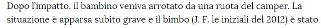 Nell'articolo dicono che stanno ricostruendo la dinamica dell'incidente. Se è stato incoscente il camperista, ne pagherà le conseguenze. Se è il bimbo che ci si è buttato sotto, i più incoscenti sono allora i genitori. Ciao Giorgio