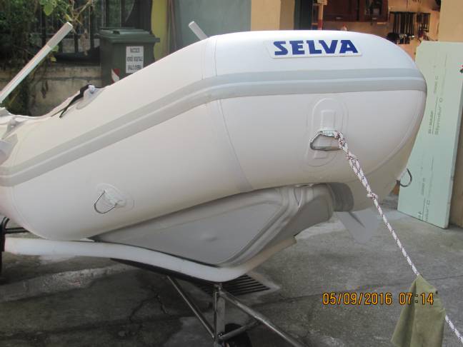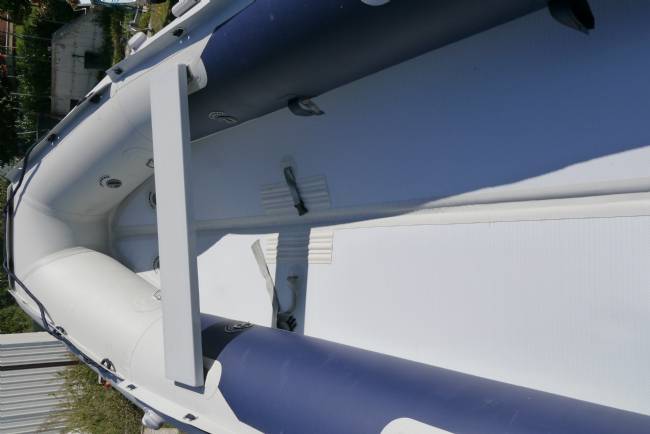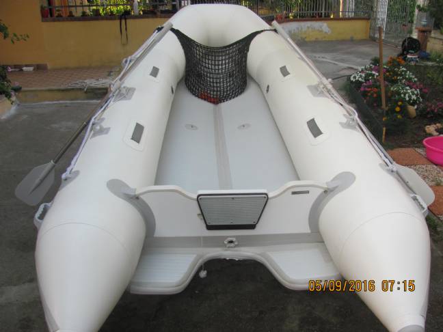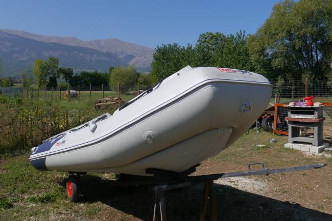 Il T38 ha il pagliolato gonfiabile. In effetti si tratta semplicemente della chiglia che si gonfia a 0,9BAR e basta. Il pregio di tale sistema è la praticità e leggerezza, perchè il gommone sta in una sola sacca, non bisognamontare nulla ma solo gonfiare. La chiglia risulta a V. Il difetto è che, soprattutto con mare un pò formato, la chiglia tende a seguire la conformazione dell'onda, deformandosi di conseguenza. Questo può dare fastidio. Ho fatto una sola stagione con il T38. Ho trovato esuberante già il 20 Hp Honda; penso che un 25 sia eccessivo. Per meglio vedere, riporto qualche foto. Questo tanto per rendersi conto di com'è il gommone. Purtroppo mi sono state caricate delle foto di traverso ed il comando di rotazione credo sia inefficiente, perchè non ha funzionato. Edito per aggiungere che i flaps che si vedono dietro impediscono il montaggio di ruote di alaggio, se non quelle dedicate; necessita quindi fruire di un carrello di alaggio, tipo quello su cui il gommone è stato fotografato. Io lo trainavo con un trattorino elettrico progettato da me e realizzato da un amico che lavora bene di tornio e fresa. / L''esperienza?? E'' la somma delle fregature!!!