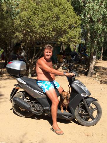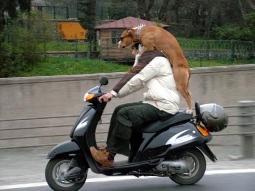 Ci sono diversi Camperisti scooteristi che hanno il cane, quasi tutti usano una cesta fissata davanti sulla pedana e legano il cane con un moschettone al gancio.