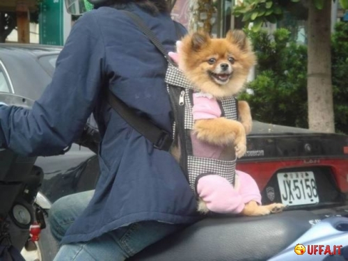 con lo scooter meglio trasportarlo tra le gambe, sulla pedana. il cane può essere assicurato all interno della borsa, tra l altro ho visto molti motociclisti che usano questo sistema con una borsa da serbatoio adattata alloscopo. ne ho visti anche con bauletto dedicato,ma se hai un cane un pò arzillo meglio sulla pedana . una volta trasportavo una beagle direttamente tra le gambe, ma se ci provi ora ti fanno un multone , che la metà basta..... LUIGI SANTONI