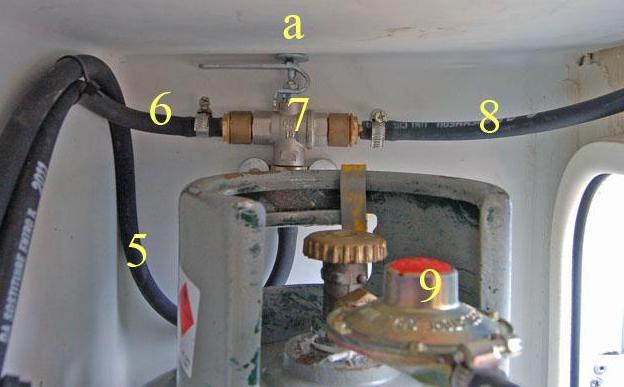 Ho ritrovato delle vecchie foto... 7 = rubinetto a 3 vie a = leva piegata dove ho saldato un'asta che finiva nel mobile sopra il vano bombole 8 = tubo che va al regolatore di pressione 9 6 = tubo che va al regolatore dipressione dall'altra bombola (che non si vede in foto) 5 = tubo che esce dal selettore e va all'impianto. Nel mobiletto interno ecco li comando per cambiare bombola: a = asta che proviene dal rubinetto lì sotto c = selettore delle due bombole (Castore e Polluce) Che delinquente che ero... Marco.