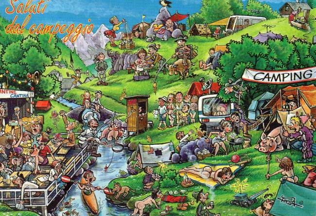 Due maiali che fanno il bagno, un maialone che dorme in tenda