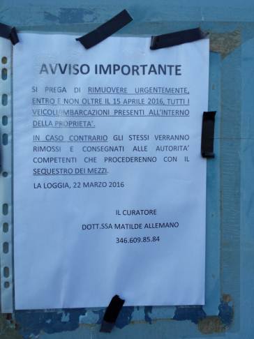 Come dice Domenico, sono quasi due anni che ho abbandonato quel rimessaggio, dopo avere parcheggiato i mezzi avuti per oltre trent'anni in quel sito ma sempre alla ricerca di una nuova soluzione, finalmente trovata con tantodi scarico, acqua potabile, corrente elettrica, cancelli elettrici, allarmi e custode, tutto cose non presenti nella vecchia sistemazione e spendendo la stessa cifra. Oltretutto molto più vicino alla mia residenza e senza più riempire di polvere o fango le auto od il camper ogni volta che mi recavo al rimessaggio. Per quanto riguarda la minaccia del curatore, penso che sia più che altro per liberarsi al più presto di tutti gli inquilini ed avere così la possibilità di agire più facilmente, gli indirizzi degli affittuari esistono presso i responsabili dell'attività, così come i numeri telefonici di ogni camperista, e non penso che sia possibile a termini di legge sequestrare senza motivo e senza avvisare in modo ufficiale le persone interessate beni di altri, oltretutto qui non vi sono neanche motivi di messa in mora , ed il curatore rischierebbe pure una denuncia per appropriazione indebita. Marino2