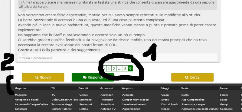 Vorrei segnalare un problema per capire se succede solo a me: La discussione che seguo di più è in marchi camper puri & novi van - velocicamperraptor . Ora mi succede in quella discussione, e solo in quella, che sevado nell'ultima pagina ( in questo momnento pagina 1962 ) scompaiano i numeri pagina in fondo rendendomi difficoltoso tornare alla pagina precedente se ho bisogno di riallacciare il filo della discussione. Ripeto, mi succede solo nell'ultima pagina e solo, per ora, in quella discussione. Navigo con firefox su macbook.