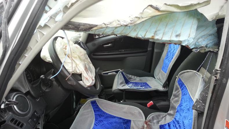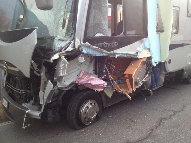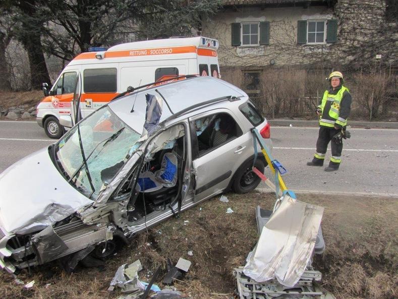 mentre il guidatore dell'auto è stato trasportato a Bolzano con l'elicottero è ricoverato in gravissime condizioni , è stato trafitto, la testa /faccia tagliata (a metà ?) dalla lamiera/fiancata che manca sul camper e che qui si vede ancora conficcata nel parabrezza è stato estratto dai pompieri volontari con l'uso delle pinze idraulche