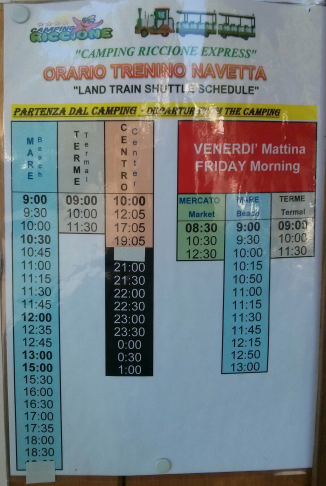 Più vicini al centro rispetto al Riccione ci sono il fontanelle e il camping Adria (quest'ultimo ha moltissimi stanziali ma ha il vantaggio di accettare card ACSI se ce l'hai, anche se in questo periodo forse non più).L'Adria è molto vicino ad una discoteca all'aperto che in passato mi ha infastidito molto (d'altro canto spero per loro fosse un'eccezione perché altrimenti non si capirebbe come possa avere clienti). Il fontanelle se ricordo bene offre soluzioni tipo camper stop e si vanta di non essere mai pieno salvo il giorno della notte rosa, dunque se non vuoi avere troppi vincoli può essere interessante. In questo periodo direi che tutti hanno ancora il checkout intorno alle 18 (ma se la cosa ti interessa verificala). Il più lontano dal Riccione invece è l'Alberello ma è vicinissimo al centro di Misano Brasile e a Misano, dunque se ti serve solo essere vicino ad un centro abitato per giostre per bimbi e negozi direi che è ottimo, se invece lo cerchi per il centro di Riccione te lo sconsiglio. Tutti questi campeggi sono un po' più spartani del camping Riccione che tende invece ad essere molto più stile villaggio turistico con molti servizi (cinema, piscina, ... ). Il Riccione come ti hanno scritto ha il trenino, ma francamente non lo apprezzo perché ovviamente ti vincola per orari (ad alcuni orari vanno in centro, in altri vanno in spiaggia e se non combinano coi tuoi sei un po' a piedi). Ovviamente è obbligato ad avere il trenino perché di tutti quelli che ti ho citato è l'unico ad essere al di là della ferrovia e non sul mare. Gli altri sono sul lungomare, l'accesso alla spiaggia avviene attraversandolo. ciao, Marco