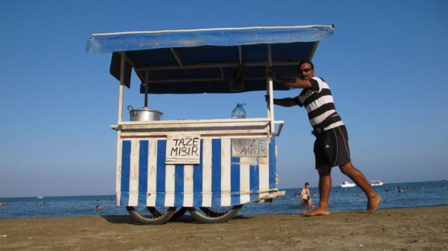 Turchia, il venditore di pannocchie abbrustolite o bollite sulla spiaggia di Yumurtalik.