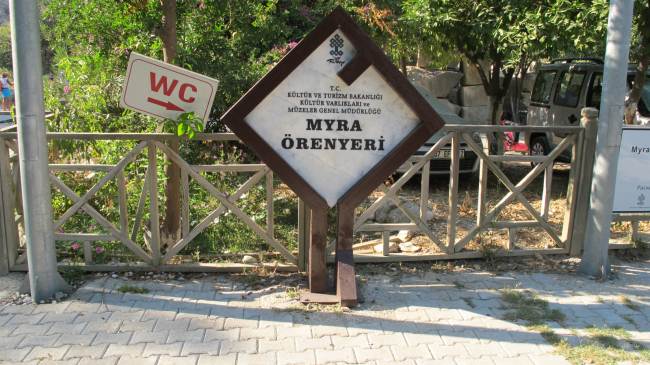 Turchia, cartello che indica che ci si trova nell'anfiteatro di Myra, il cartello wc è un po' giù di posto.