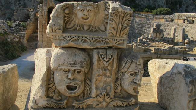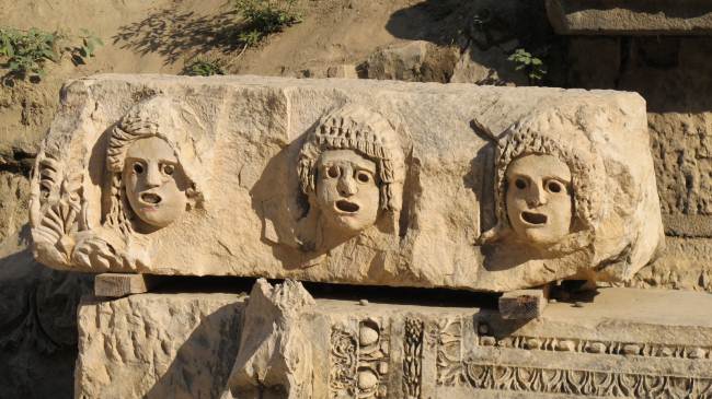 Turchia, maschere teatrali scolpite nei capitelli dell'anfiteatro di Myra.