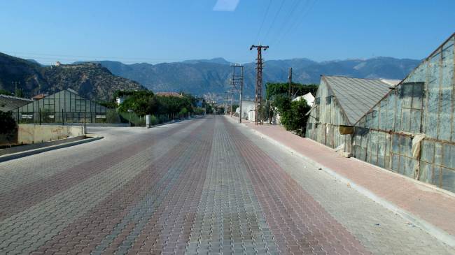 Turchia, tutto il territorio nei pressi di Myra è coperto da serre per la coltivazione di ortofrutticoli e le strade sono quasi sempre con il fondo in autobloccante.