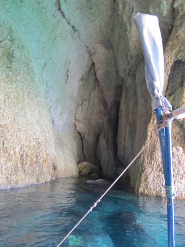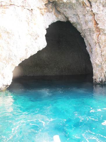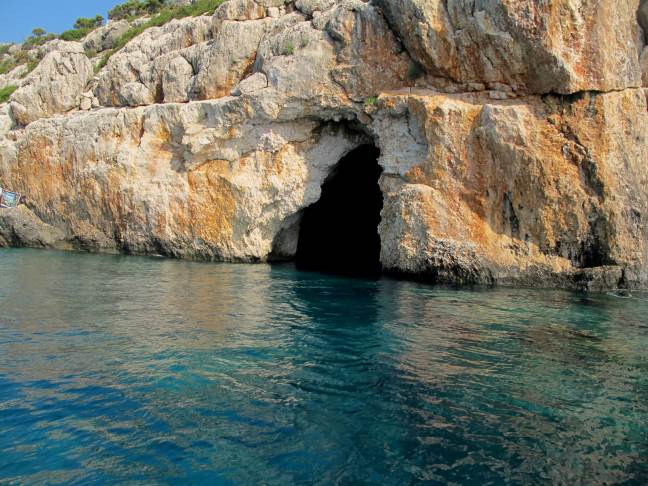 Turchia, lungo la navigazione sosta in una piccola grotta dove l'acqua del mare è di un blu cobalto unico.