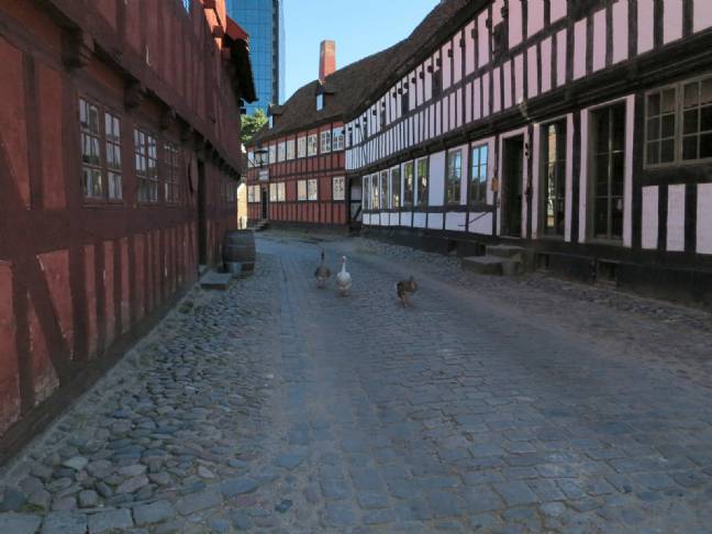 Danimarca, simpatiche papere a passeggio in una strada del Vecchio villaggio "Den Gamle By" ad Århus.